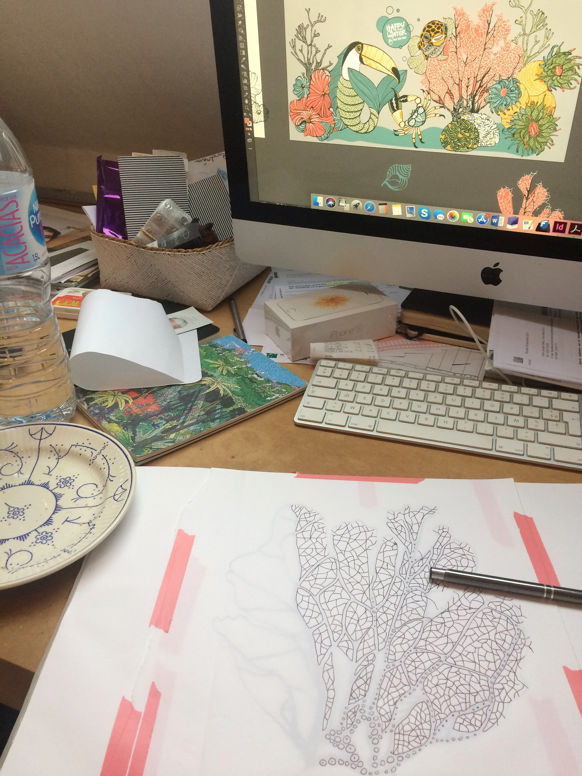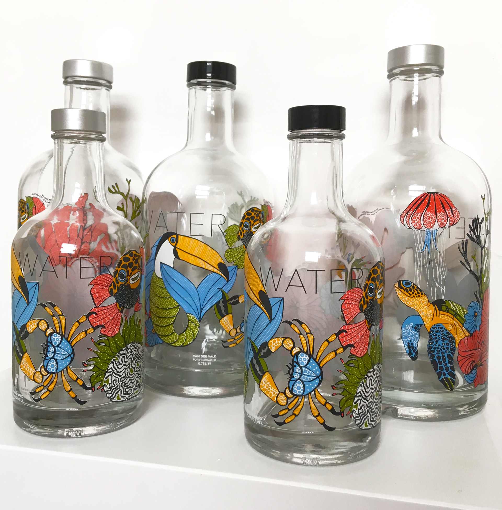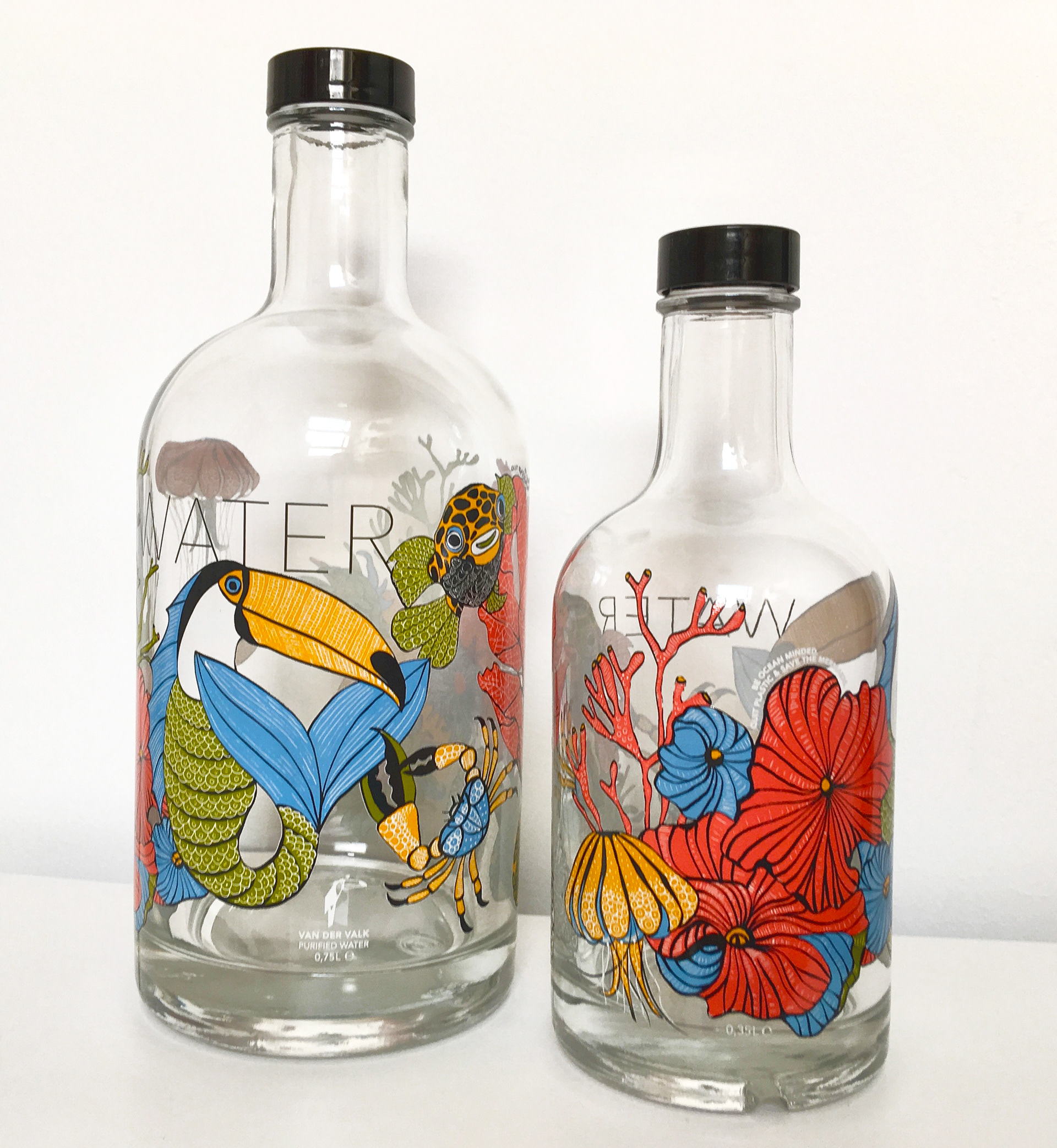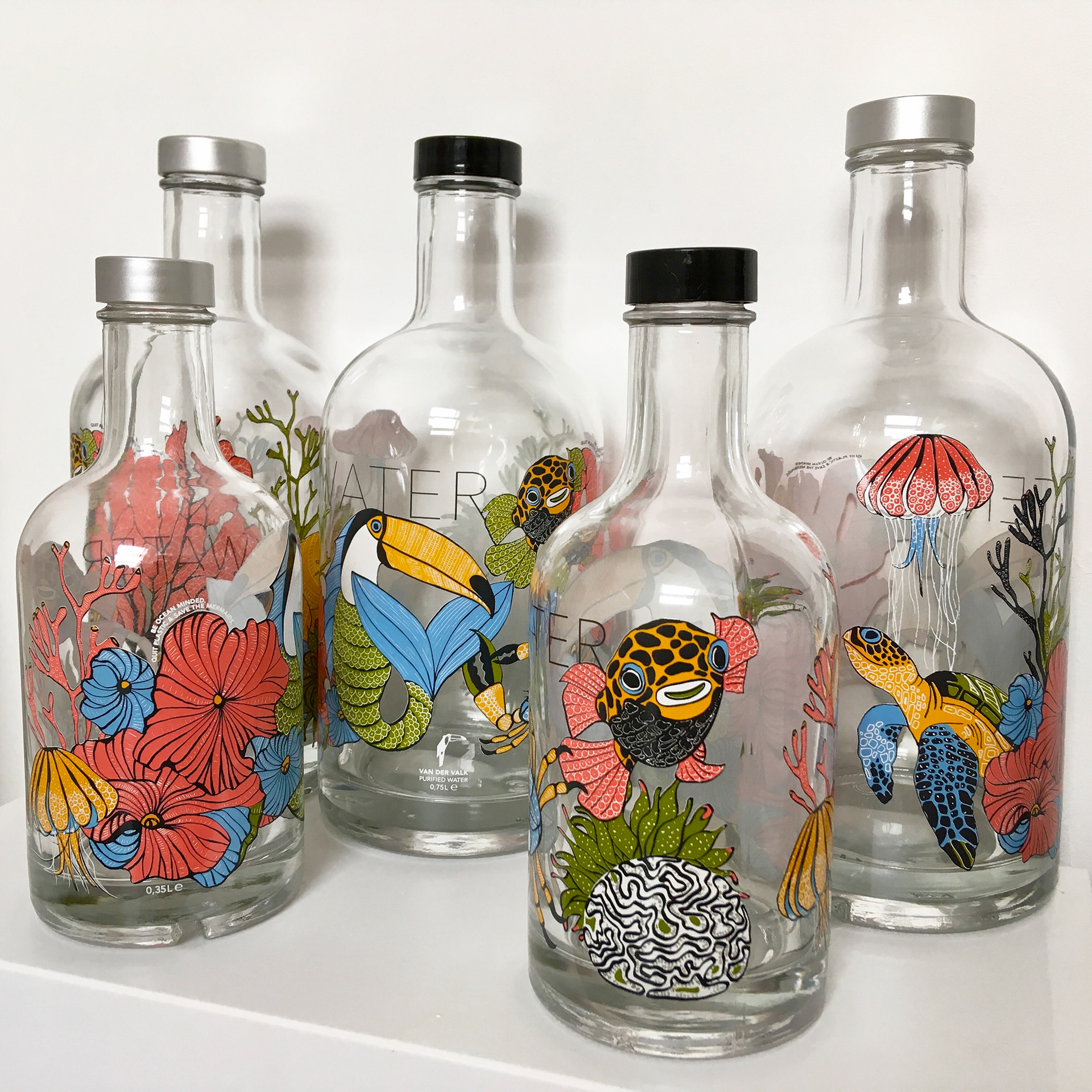 These crazy eye-catching water bottles I designed for Van der Valk restaurants. They promote the use of filtered tapwater and reusable bottles. (Be ocean-minded. Quit plastic & save the mermaids!) I've been told that the bottles often mysteriously disappear from the tables...not sure if that's good or bad news. ;)